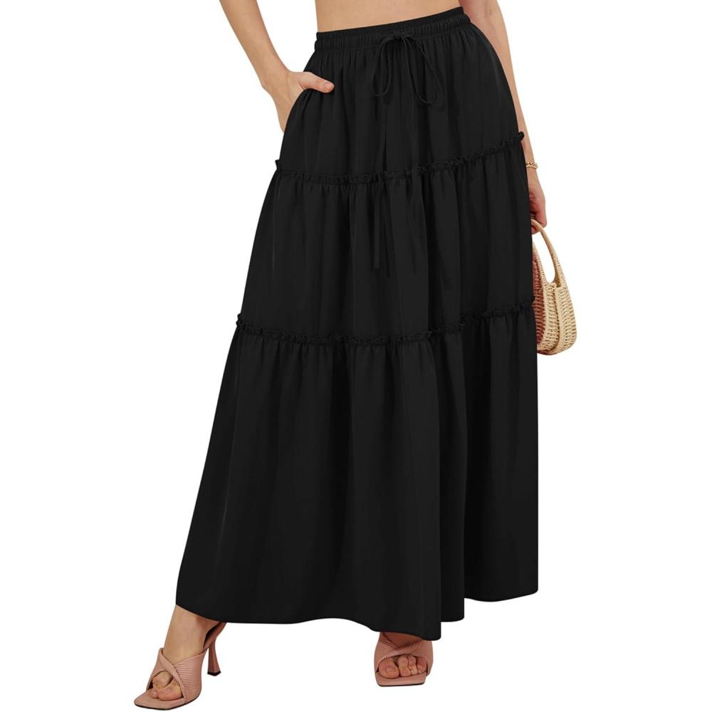 NASHALYLY Skirts for Women Boho Elastic Waisted Drawstring Swing Ruched 3 Tiered Maxi Skirt with Pockets(Black)