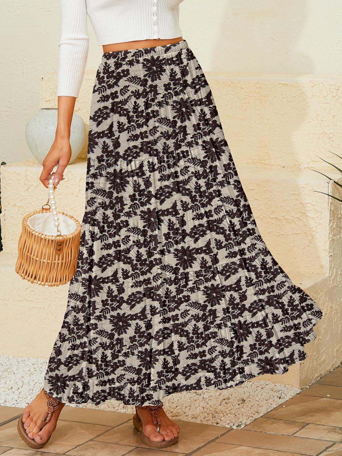 NASHALYLY Women's Chiffon Elastic High Waist Pleated A-Line Flared Maxi Skirts(Apricot Brown Floral)