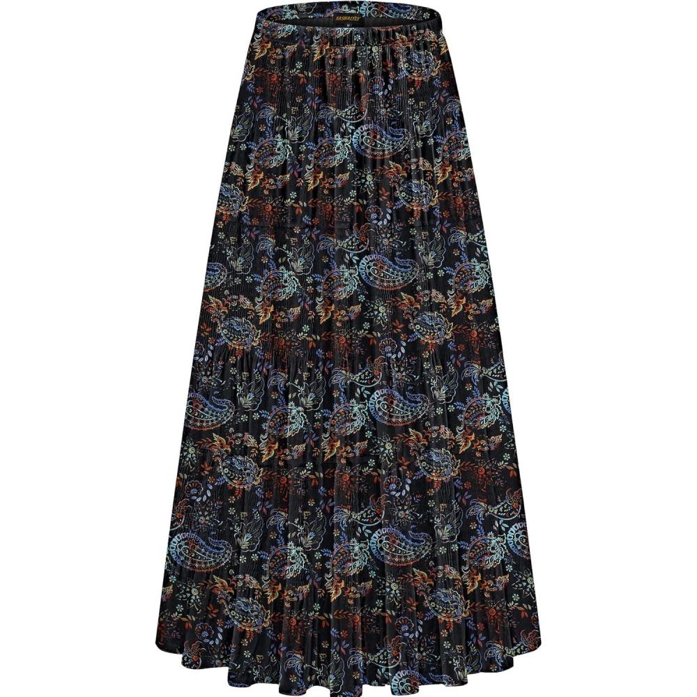 NASHALYLY Women’s Chiffon Elastic High Waist Pleated A-Line Flared Maxi Skirts(Black Boho Floral)