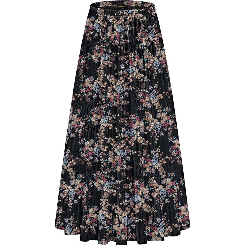 NASHALYLY Women's Chiffon Elastic High Waist Pleated A-Line Flared Maxi Skirts(Black Floral-c)