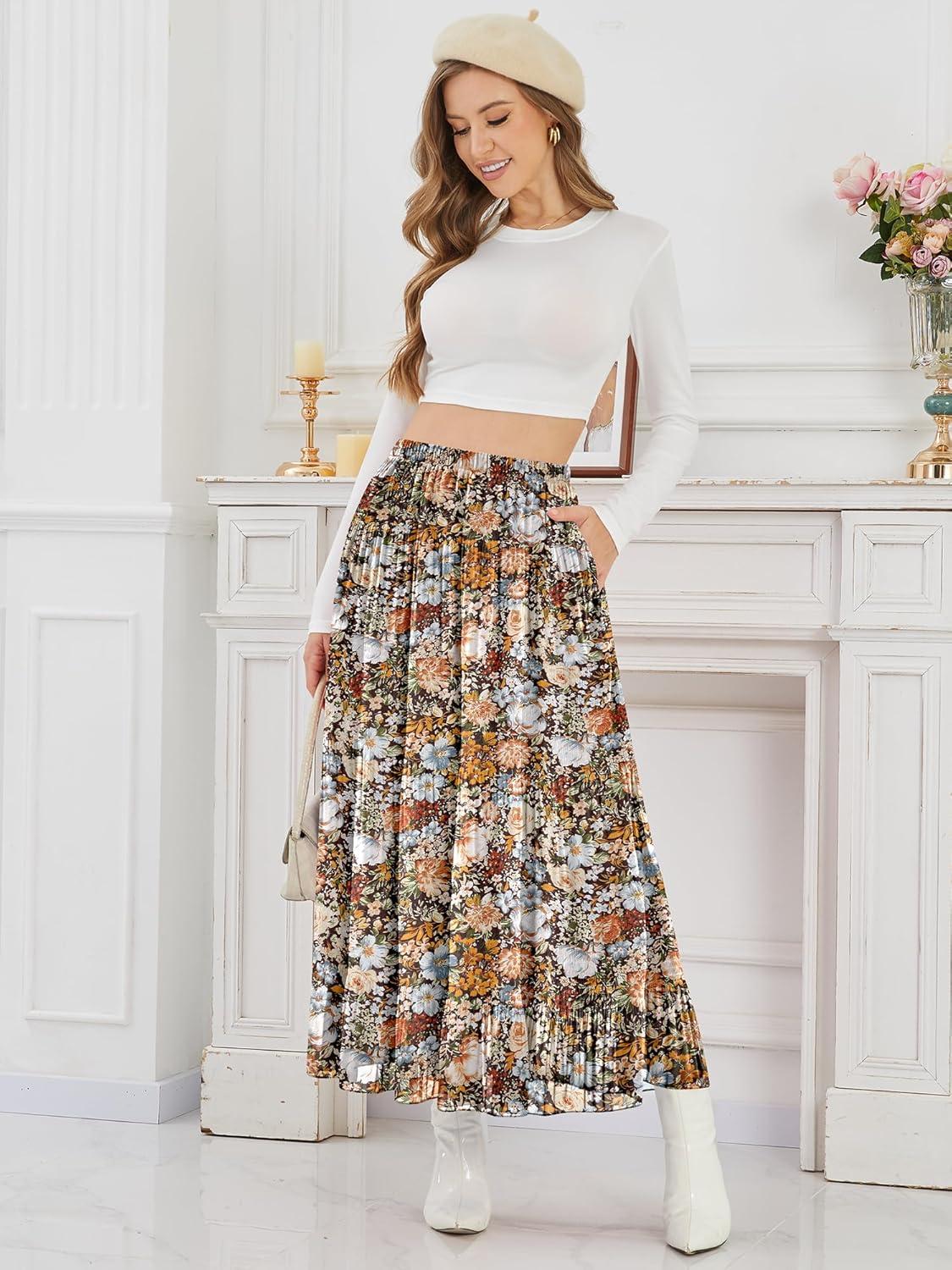 NASHALYLY Women's High Waisted Maxi Skirt,Elastic Chiffon Boho Long Skirt with Pockets(Coffee Floral P)